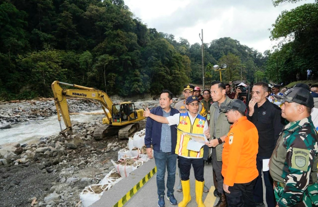 Tanah Datar, Sindotime-Menteri Koordinator Bidang Infrastruktur dan Pembangunan Kewilayahan, Agus Harimurti Yudhoyono (AHY), melakukan peninjauan langsung ke kawasan Mega Mendung Silaing, jalur menuju Air Terjun Lembah Anai, Selasa (2/12). Kunjungan tersebut dilakukan untuk memastikan percepatan perbaikan jalan nasional dan normalisasi sungai pasca banjir bandang yang melanda wilayah itu. Bupati Tanah Datar, Eka Putra, turut mendampingi rombongan kementerian dalam agenda tersebut.