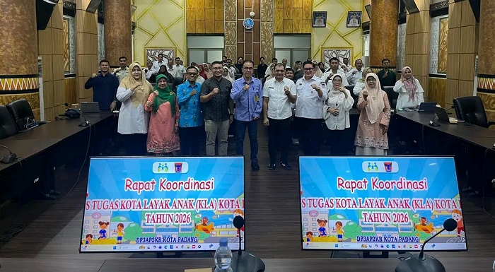SINDOTIME.COM-Pemerintah Kota Padang memperkuat upaya pemenuhan hak anak melalui Rapat Koordinasi Gugus Tugas Kota Layak Anak (KLA) tahun 2026 yang berlangsung di Ruang Abu Bakar Jaar, Balai Kota Padang, Rabu (15/4). Pertemuan ini difokuskan pada penyelarasan strategi dan peningkatan kinerja lintas sektor guna mengoptimalkan capaian penilaian KLA tahun ini.