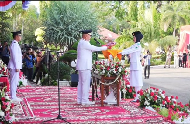 pelaksanaan upacara bendera di halaman Kantor Gubernur Sumbar, Minggu (17/8).