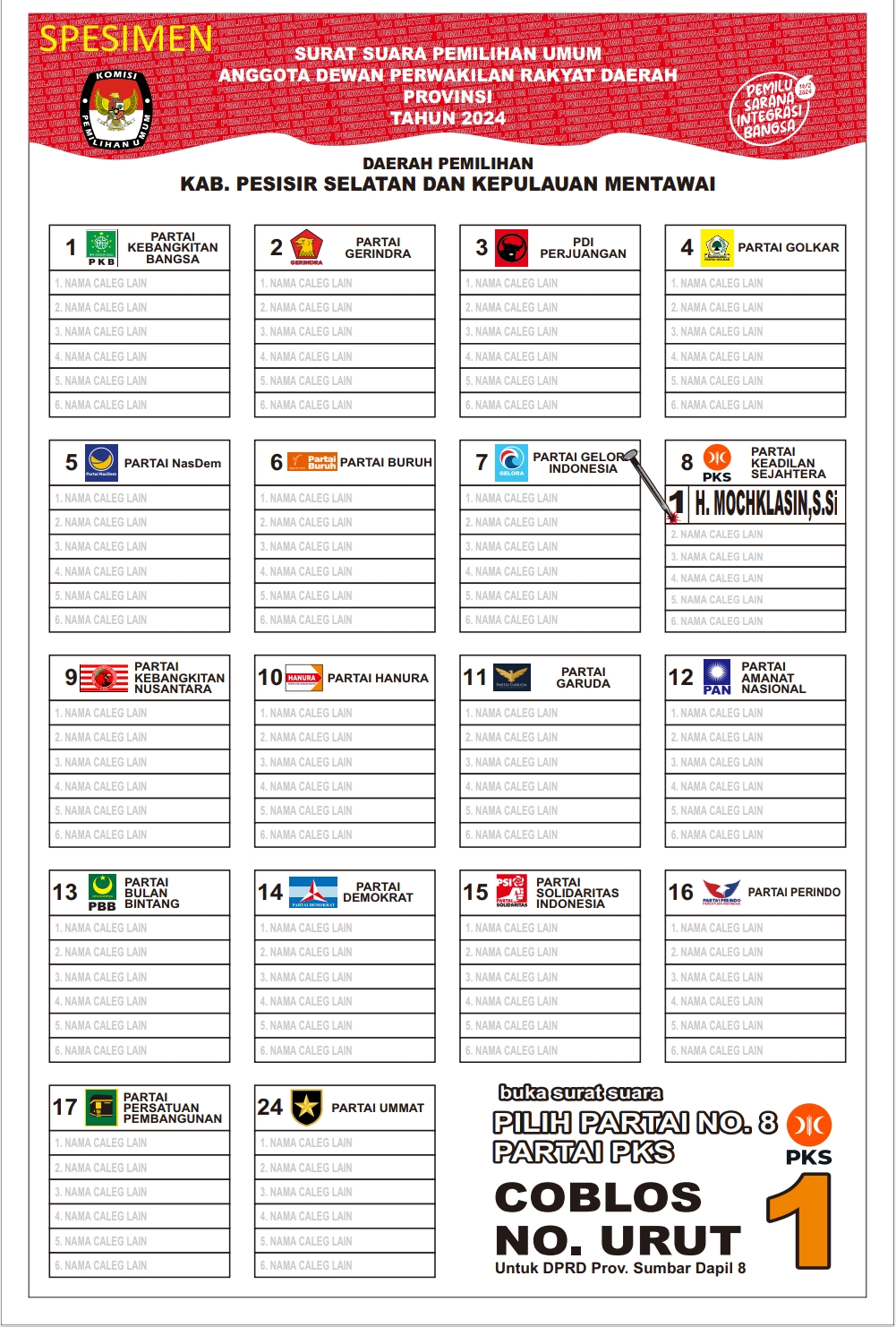 Padang SINDOTIME.COM — Bapak H. Mochlasin, S.Si diamanahkan lagi menjadi calon anggota DPRD Provinsi Sumatera Barat Nomor Urut.1 dari partai PKS Daerah Pilihan Pesisir Selatan dan Mentawai Provinsi Sumatera Barat.
