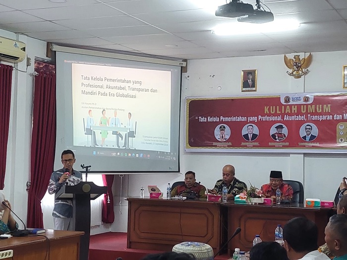 PANDANGAN: Asisten I Pemko Padang, Edy Hasymi saat menjadi pemateri Kuliah Umum di Fisipol Unes, Padang, Jumat (27/9/2024).(sumber : pemko padang)