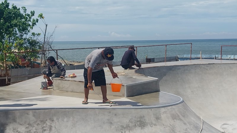 SIAP DIGELAR: Sejumlah pekerja terlihat sedang merampungkan pekerjaan skatepark di kawasan objek wisata Pantai Padang, Muaro Lasak.(pemko padang)