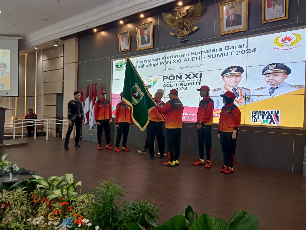 DUKUNGAN: Gubernur Sumbar, Mahyeldi Ansharullah menyerahkan bendera kontingen ke Ketua KONI Sumbar saat pelepasan kontingen PON Sumbar, di Auditorium Gubernur Sumbar, Minggu (1/9/2024).(sumber : koni sumbar)
