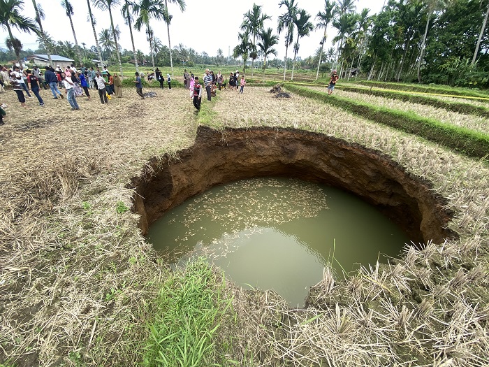Limapuluh Kota, Sindotime—Masyarakat yang ada di kawasan persawahan Jorong Tepi, Nagari Situjuah Batu, Kecamatan Situjuah Limo Nagari, Kabupaten Limapuluh Kota dikejutkan dengan sebuah fenomena geologi berupa amblesan tanah atau sinkhole yang terjadi pada Minggu (4/1). Lokasi kejadian berada di jalur alternatif yang menghubungkan Kota Payakumbuh dengan Kabupaten Tanah Datar, sehingga peristiwa ini langsung menarik perhatian warga dan pengguna jalan.