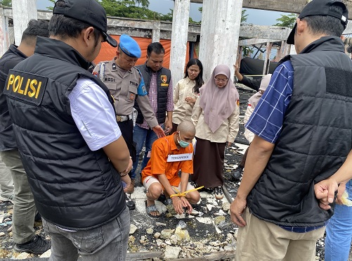 Rekonstruksi dimulai dengan adegan tersangka memasuki kawasan pasar dengan cara memanjat, lalu beraktivitas di lantai dua bangunan bekas Toko Aprilia. Rangkaian adegan berlanjut dari aktivitas menghisap lem, beristirahat, hingga pembuatan api unggun kecil menggunakan plastik, yang akhirnya menjadi awal terjadinya kebakaran besar di kawasan pertokoan tersebut.(*/zoe)