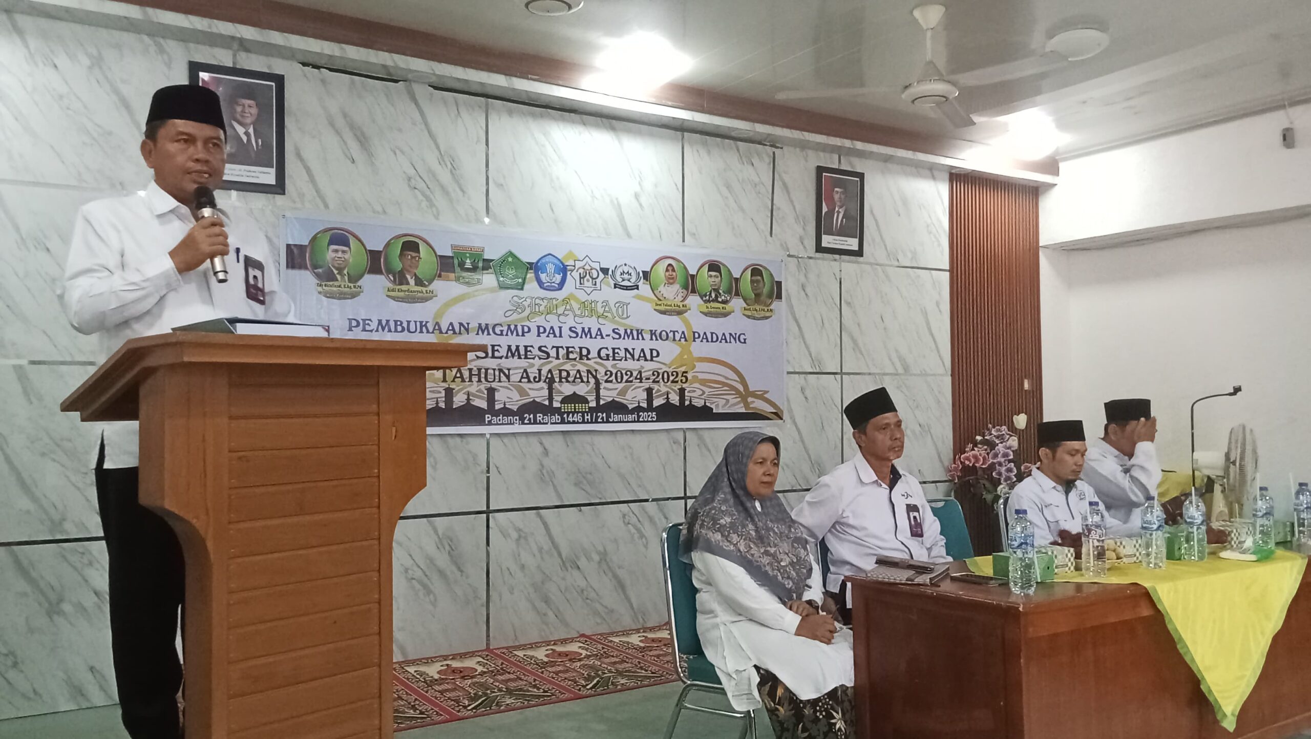 DIBUKA: Kakan Kemenag Kota Padang, Edy Oktafiandi saat membuka MGMP PAI tingkat SMA dan SMK se-Kota Padang.