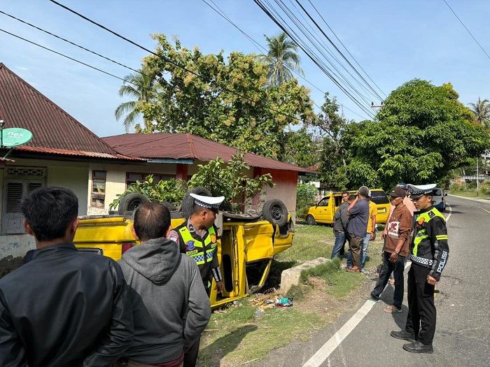 Akibat hilangnya keseimbangan, mobil akhirnya terguling ke sisi kiri badan jalan. Benturan tersebut menyebabkan pengemudi dan seluruh penumpang mengalami luka ringan.