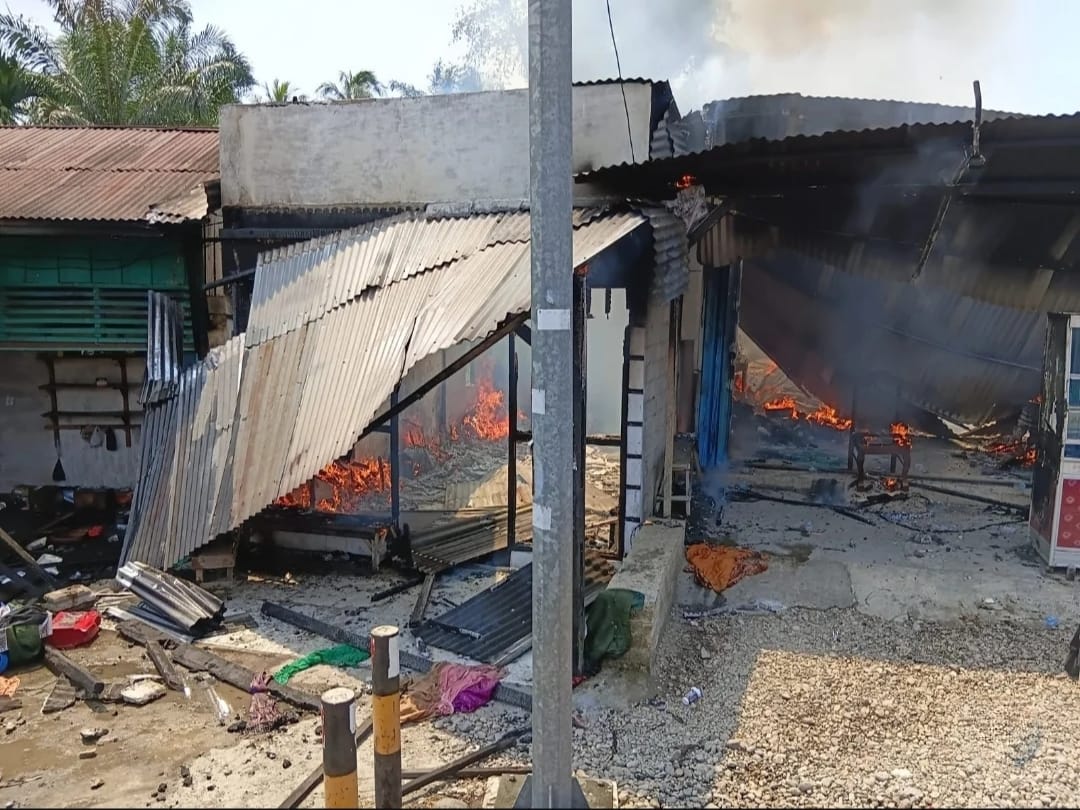 Pasbar, Sindotime—Dua bangunan rumah di Nagari Simpang Tigo, Kecamatan Luhak Nan Duo, Kabupaten Pasaman Barat, Sumatera Barat, dilahap si jago merah pada Sabtu (24/1). Dua rumah tersebut selama ini difungsikan sebagai tempat usaha dan kini mengalami kerusakan berat setelah dilalap api.