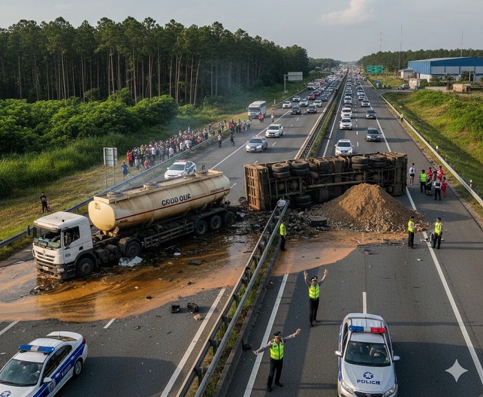 Peristiwa berlangsung saat kondisi jalan relatif sepi karena masih dini hari. Namun, tumpahan minyak sawit yang menggenangi aspal membuat permukaan jalan menjadi licin dan membahayakan pengendara lain. Arus lalu lintas sempat mengalami kemacetan sementara hingga petugas melakukan penanganan di lokasi.