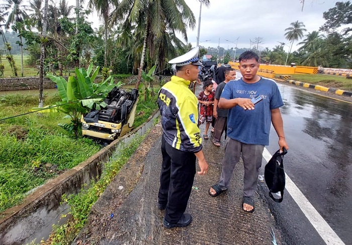“Ketika sampai di TKP pengemudi melakukan pengereman, tetapi kendaraan justru hilang kendali ke sisi kiri dan terjatuh,” ujar Ipda Rudi Purnama saat memberikan keterangan pada Selasa malam.