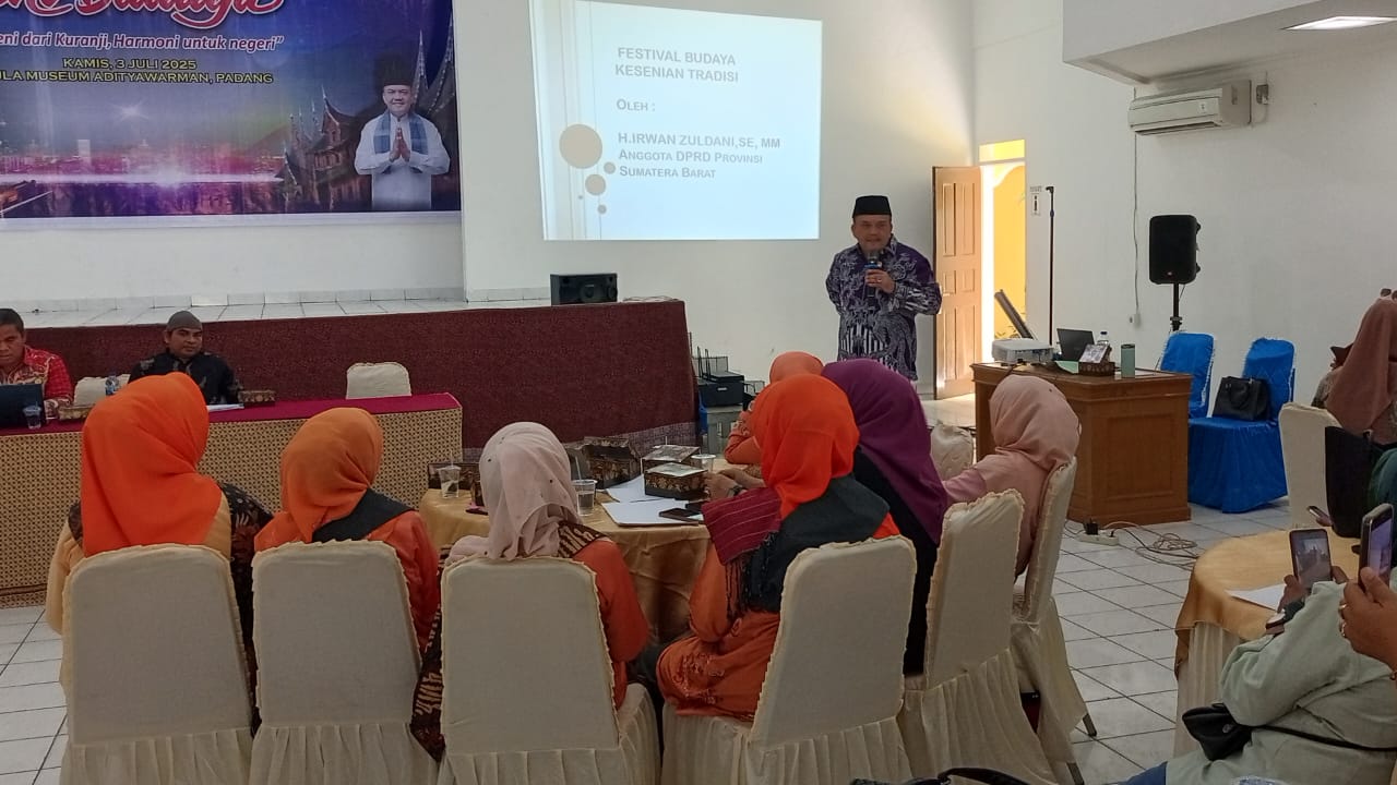 DIPAPARKAN: Anggota Komisi III DPRD Sumbar, Irwan Zuldani memberikan penjelasan mengenai kegiatan Festival Seni Budaya bertajuk “Giat Seni dari Kuranji, Harmoni untuk Negeri” saat sosialisasi kegiatan tersebut di Aula Meseum Adityawarman.(zoe/sindotime)
