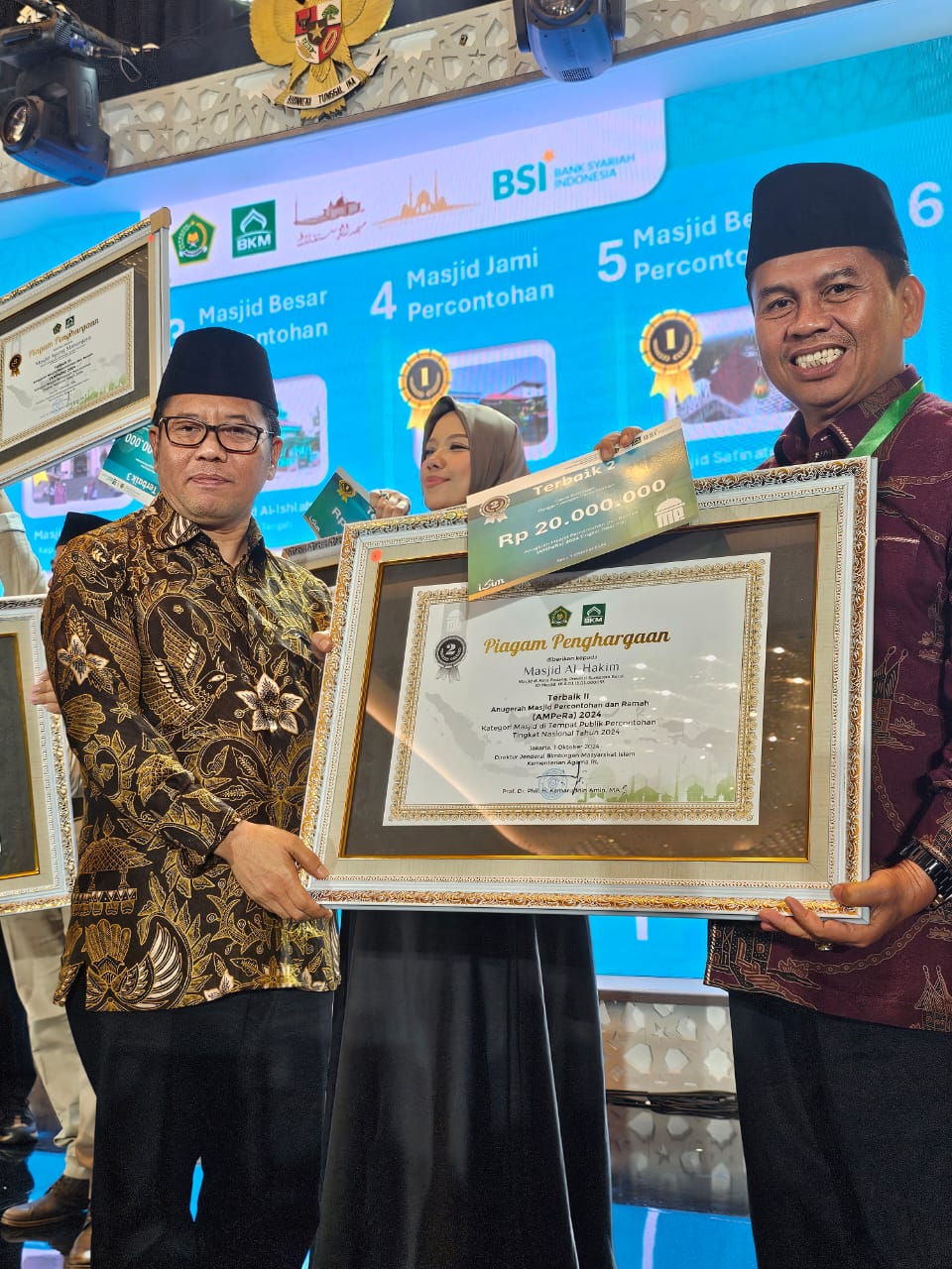 BIKIN BANGGA: Kakan Kemenag Kota Padang, Edy Oktafiandi ketika menerima penghargaan untuk Masjid Al Hakim Kota Padang yang berhasil dinobatkan sebagai masjid terbaik II Anugerah AMPeRa 2024 untuk kategori Masjid di Tempat Publik Percontohan tingkat Nasional Tahun 2024 di Hotel Swiss Belhotel, Surakarta, Selasa (1/10/2024).(sumber : kemenag padang)
