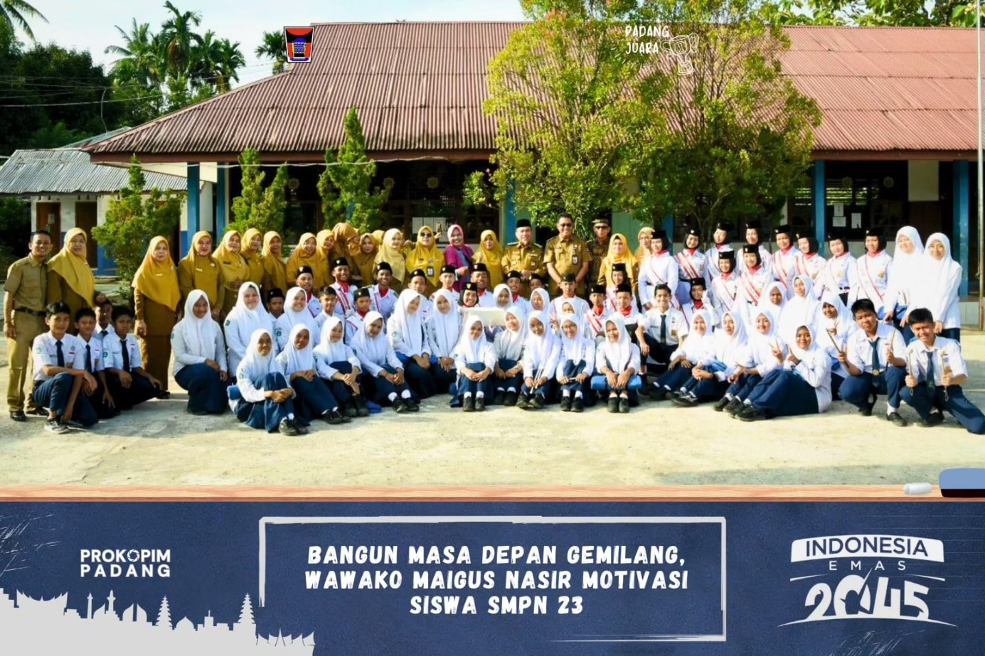 DUKUNGAN: Wawako Padang, Maigus Nasir bersama keluarga besar SMPN 23 Padang usai upacara bendera.(pemko padang)