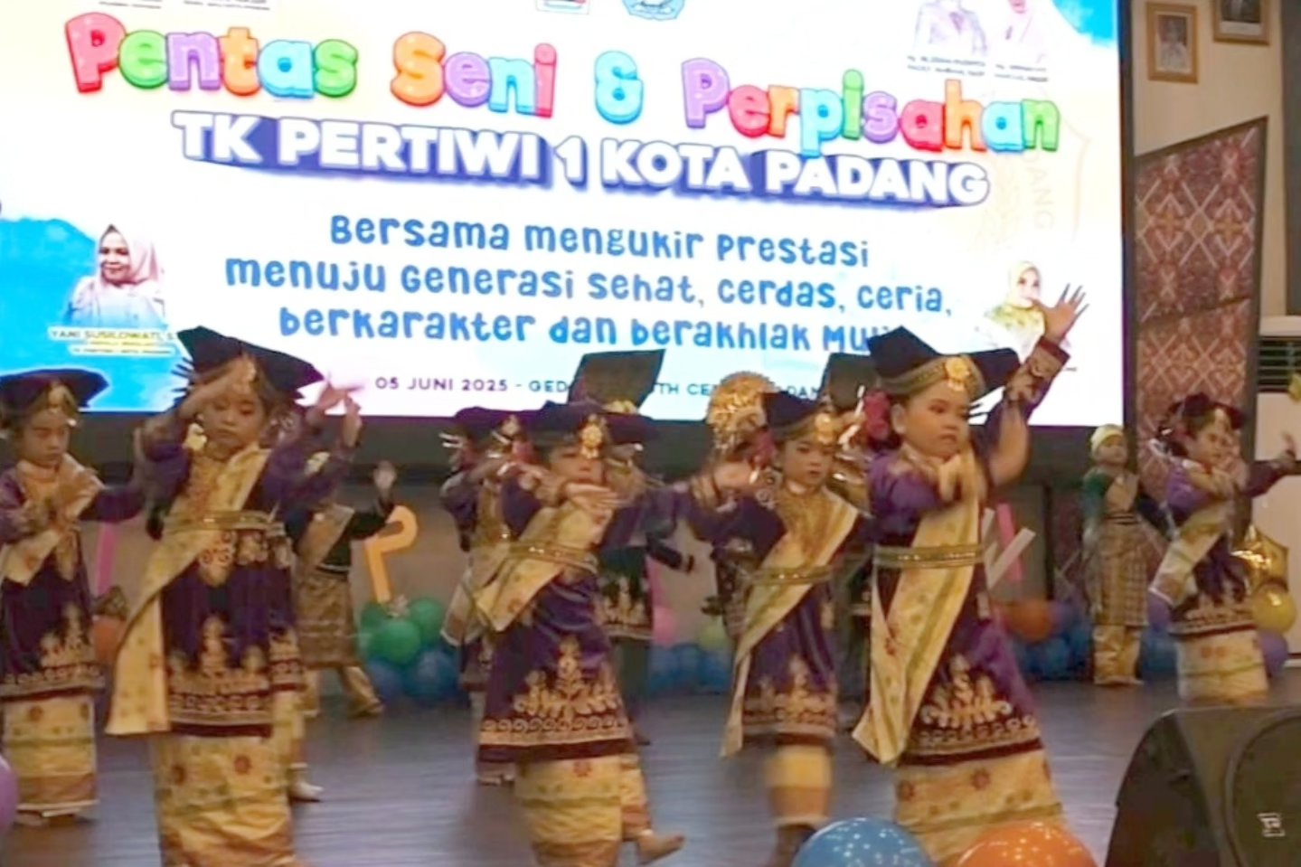 BERBAKAT: Murid TK Pertiwi 1 Kota Padang unjuk kebolehan dalam pentas seni sekaligus perpisahan yang digelar di Gedung Youth Center pada Kamis (5/6).(pemko padang)