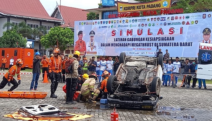 BERJIBAKU: Suasana latihan gabungan kesiapsiagaan bencana di Lapangan APEKSI Balai Kota Padang.(pemko padang)