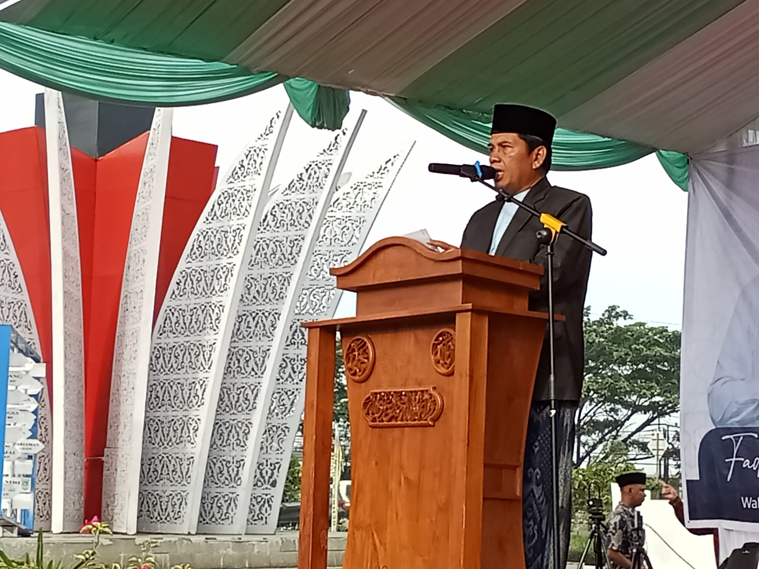 ARAHAN: Kakan Kemenag Kota Padang, Edy Oktafiandi ketika memberikan sambutan saat pelaksanaan Shalat Idul Fitri 1446 H di Lapangan Apeksi Balaikota Aie Pacah, Padang.(harris tj/sindotime)