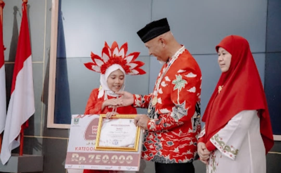 BIKIN BANGGA: Afiqa Carissa Makmur, peraih Juara ketiga Lomba Presenter, Penyiar dan MC menerima penghargaan dari Gubernur Sumbar, Mahyledi Ansharullah.(sumber : pemprov Sumbar)