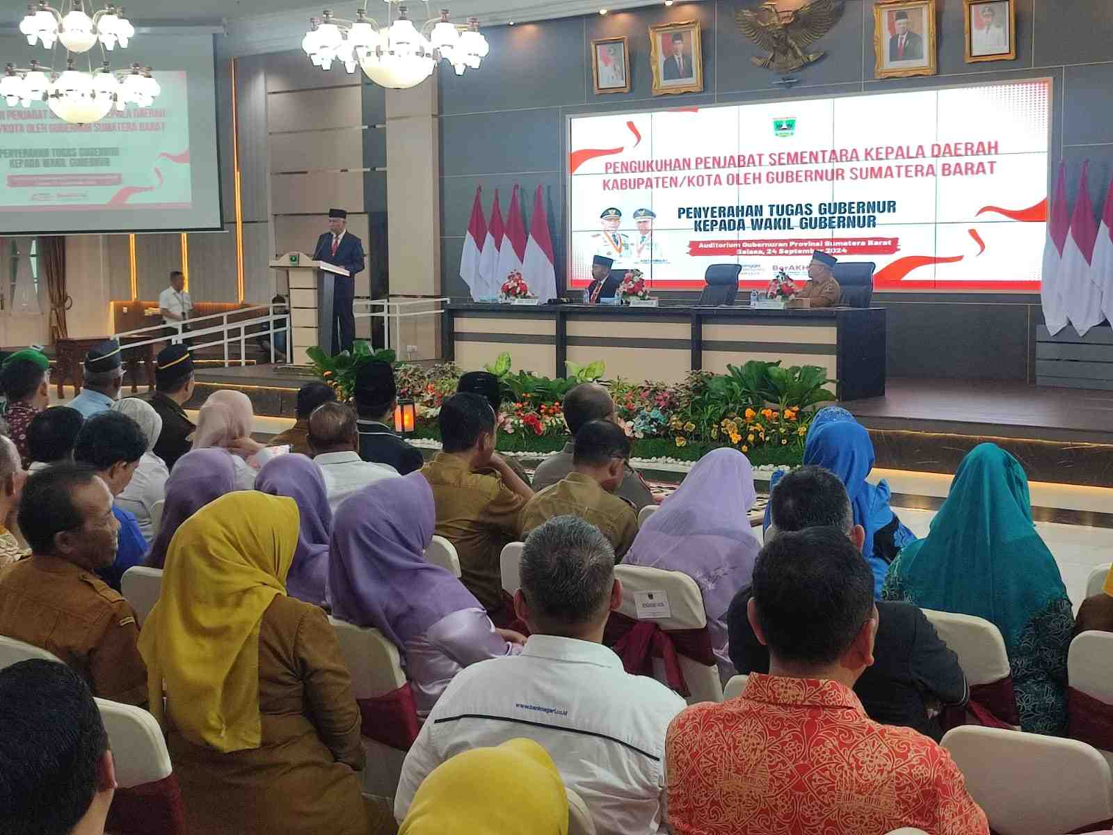 DISERAHKAN: Suasana penyerahan tugas Gubernur kepada Wakil Gubernur di Auditorium Istana Gubernur Sumbar.(sumber : pemprov sumbar)