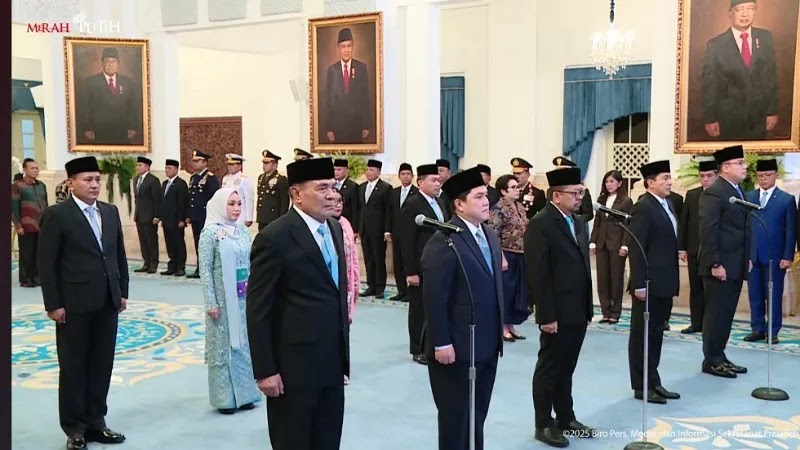 DIKUKUHKAN: Jajaran Menteri kabinet Merah Putih yang dilantik oleh Presiden Prabowo Subianto di Istana Kepresidenan, Rabu (17/9).(youtube/biro setpres)