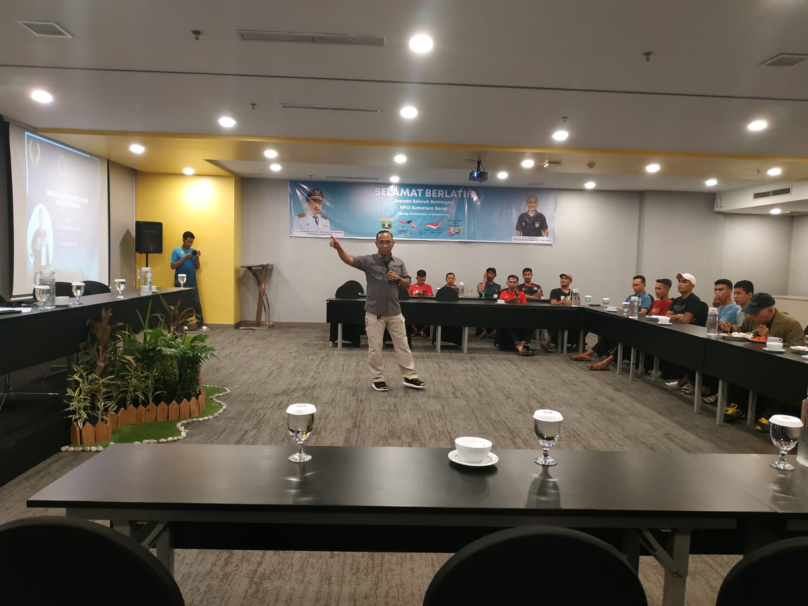 ARAHAN: Wakil Binpres NPCI Sumbar, Alfroki Martha, memberikan materi tentang Pemecahan Masalah Menuju Pertandingan di sela-sela pemusatan latihan terpadu atlet Peparnas Sumbar di Ibis Hotel, Minggu malam (29/9/2024).(sumber : tim perparnas sumbar)