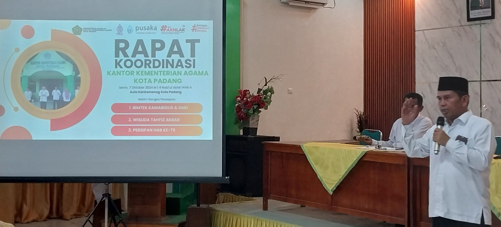 ARAHAN: Rapat koordinasi dengan jajaran di semua unit satuan kerja, berlangsung di aula lantai 2 kemenag setempat, Senin (7/10).(sumber : kemenag kota padang)