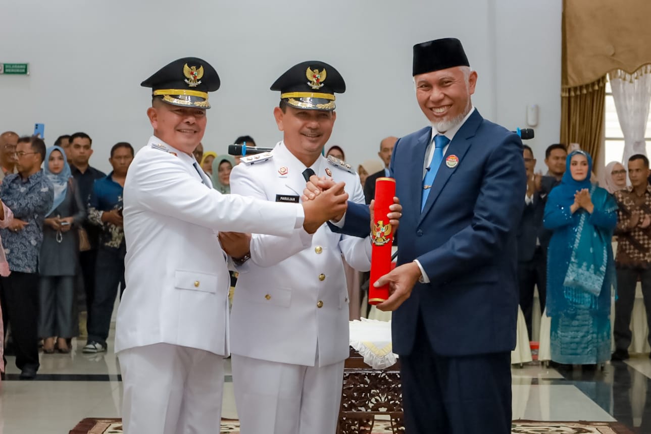 RESMI: Bupati dan Wakil Bupati Pasaman periode 2025–2030, Welly Suhery dan Parulian saat dilantik Gubernur Sumbar, Mahyeldi Ansharullah di Auditorium Gubernuran Sumbar pada Jumat (30/5). (pemprov sumbar)
