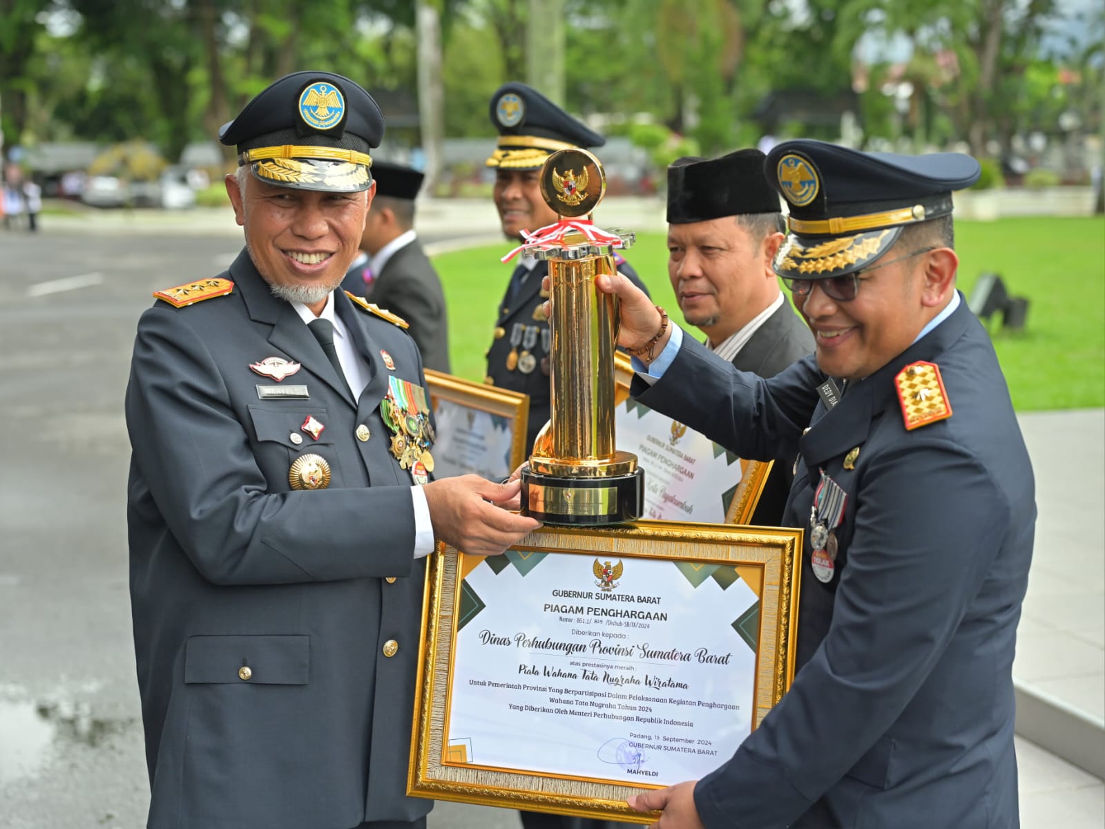 REWARD: Gubernur Sumbar, Mahyeldi Ansharullah ketika menyerahkan penghargaan kepada Kedishub Sumbar, Dedy Diantolani pada peringatan Hari Perhubungan Nasional (Harhubnas) 2024.(sumber: pemprov sumbar)