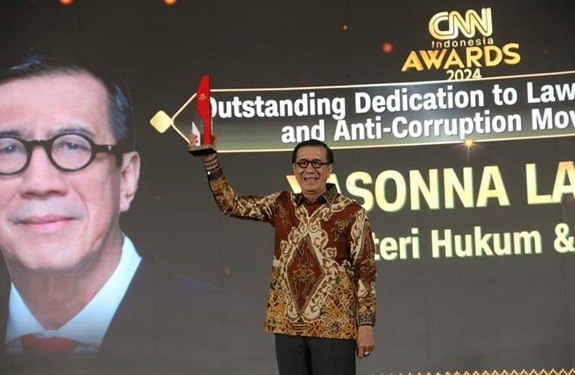 REWARD: Menkum HAM, Yasonna H. Laoly, diganjar penghargaan dalam CNN Indonesia Award 2024 kategori Outsanding Dedication to Law Enforcement and Anti Corruption Movement.(foto: Kemenkum HAM)