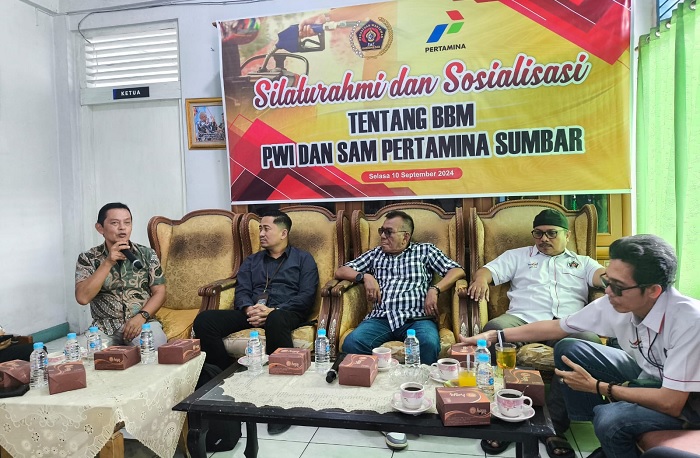 DISKUSI: Ketua PWI Sumbar, Widya Navies ketika menyambut kedatangan Sales Area Manager Pertamina Sumbar, Narotama dan jajaran ke sekretariat PWI Sumbar, Selasa (10/9/2024).(sumber : pwi sumbar)