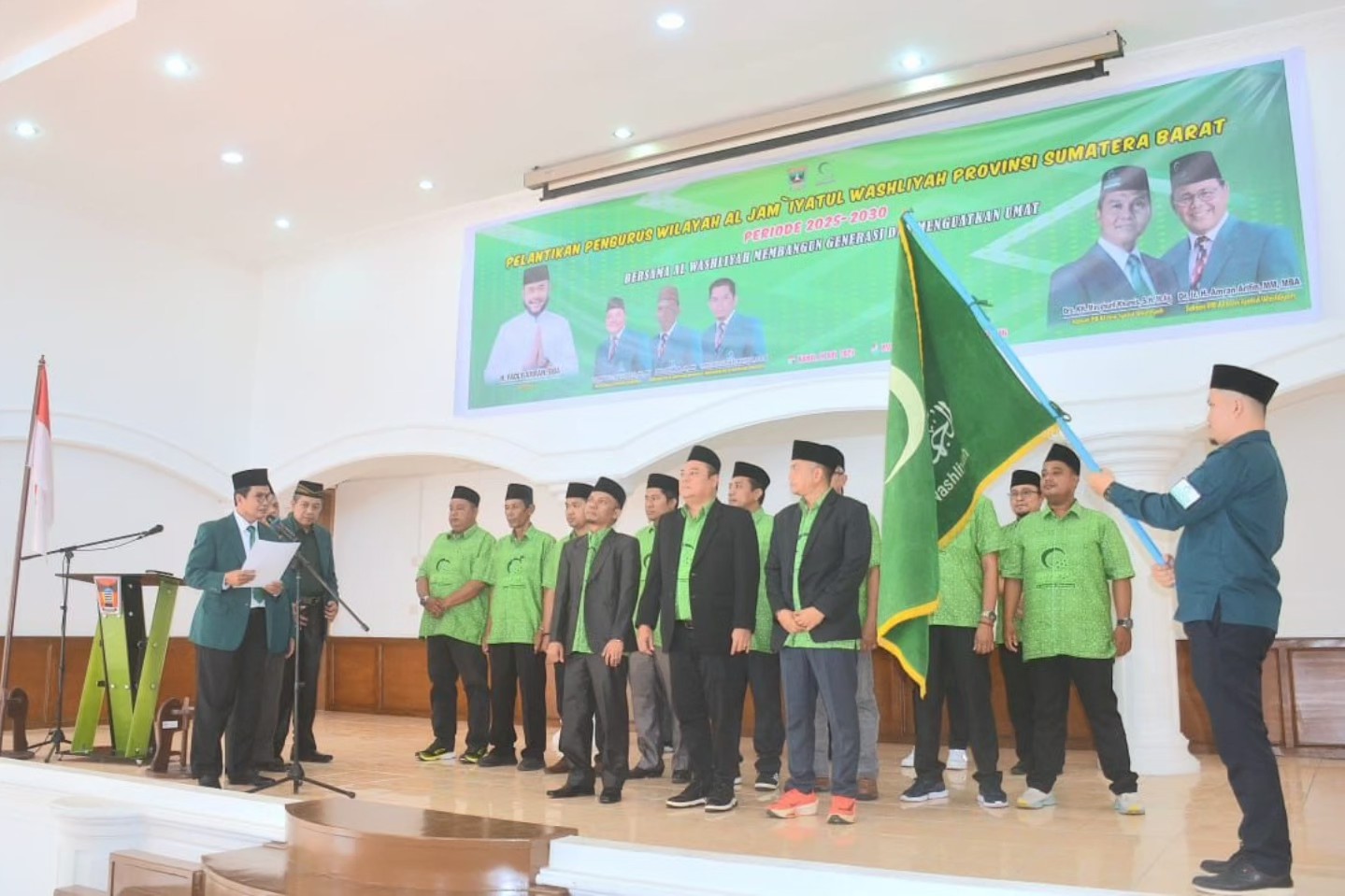 DIKUKUHKAN: Prosesi pelantikan PW Al Jam’iyatul Washliyah Sumbar masa bakti 2025–2030 di Palanta, kediaman resmi Wali Kota Padang, pada Kamis, (10/7).(pemko padang)