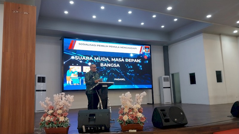 ARAHAN: Pj Wali Kota Padang, Andree Harmadi Algamar saat membuka Sosialisasi Pemilih Pemula Menyambut Pilkada 2024 di Youth Centre, Kamis (14/11).(pemko padang)