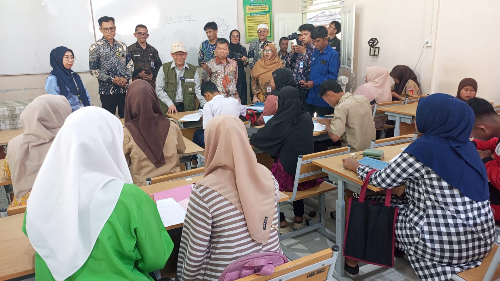 CEK LAPANGAN: Kepala Pengembangan dan Pembinaan Bahasa Kemendikdasmen, Hafidz Muksin didampingi Kabid PSMA, Mahyan serta Kepala SMAN 8 Padang, Berry Devanda saat pemantauan SPMB di SMAN 8 Padang pada Kamis (26/6).(zoe/sindotime)