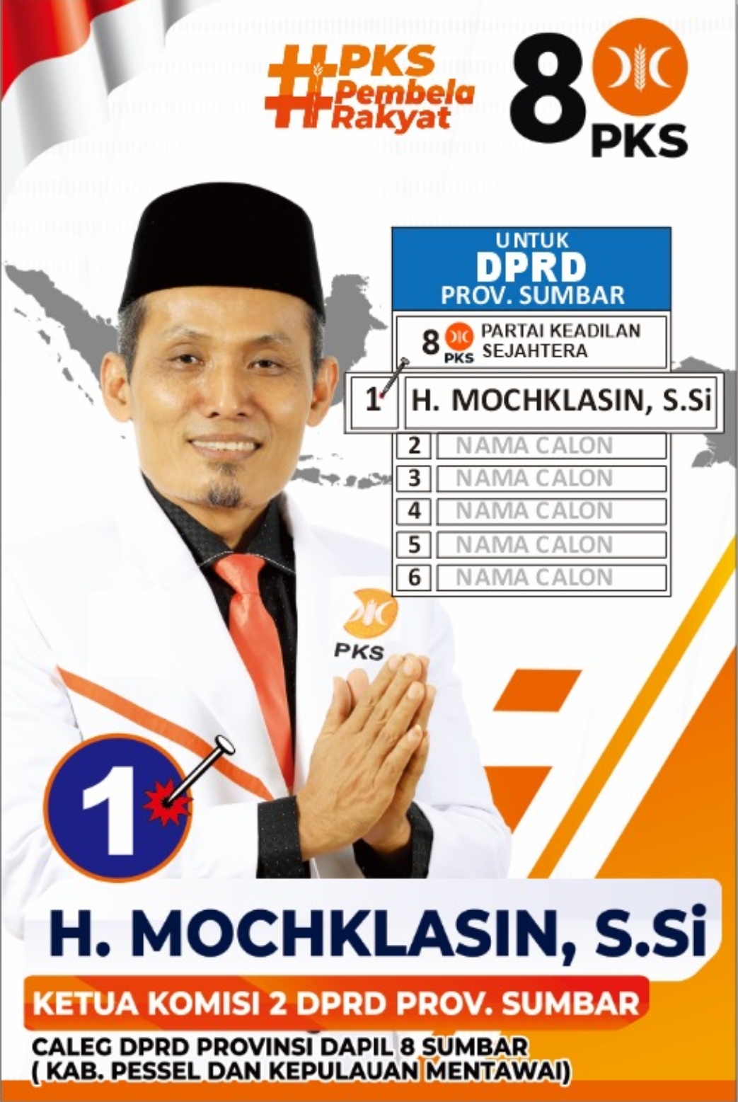 Padang SINDOTIME.COM — Bapak H. Mochlasin, S.Si diamanahkan lagi menjadi calon anggota DPRD Provinsi Sumatera Barat Nomor Urut.1 dari partai PKS Daerah Pilihan Pesisir Selatan dan Mentawai Provinsi Sumatera Barat.