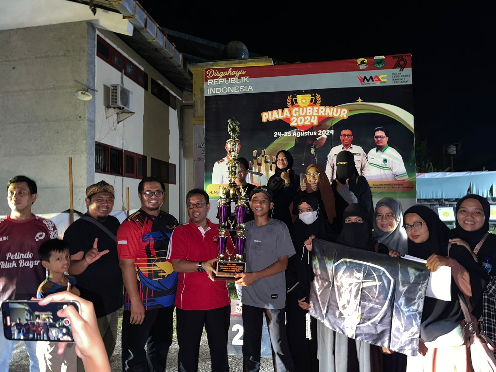 BIKIN BANGGA: Ketua MAC, yang juga Kepala DLH Sumbar Tasliatul Fuaddi mewakili Gubernur Sumbar, Mahyeldi Ansharullah menyerahkan piala utama Gubernur Sumbar kepada tim Paryarc Pariaman Archer yang menjadi juara umum di Kejuaraan memanah antar club se-Sumatera Barat yang berakhir di Lapangan Panahan Sumbar, Komplek GOR H. Agus Salim, Kota Padang.(sumber : mac)