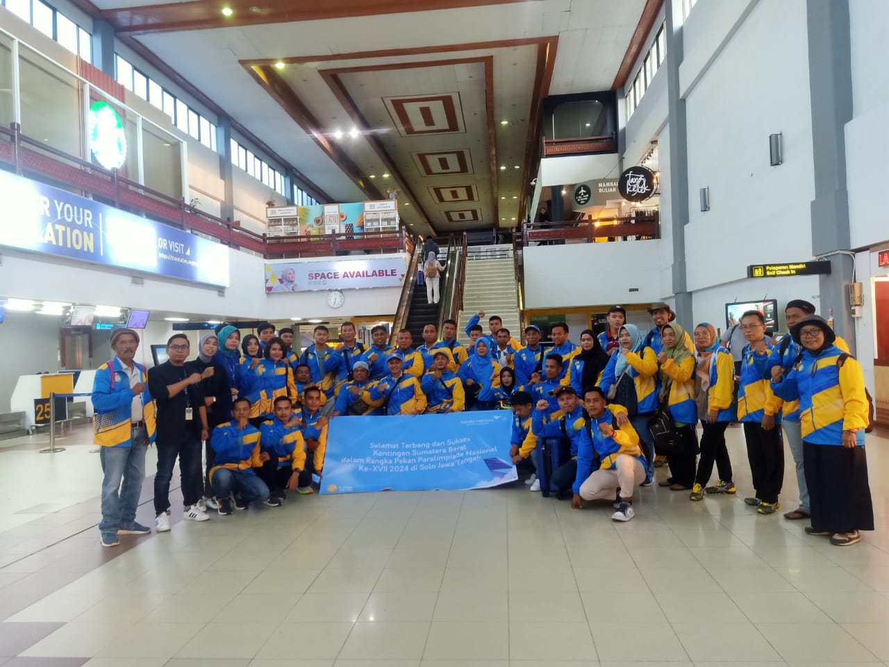 Padang, Sindotime-Tim Pekan Paralimpiade Nasional (Peparnas) XVII Sumbar bertolak menuju Solo, Kamis (3/10/2024). Tim ini hanya berjumlah sebanyak 23, minus atlet angkat berat, Juliarty yang gagal berangkat dikarenakan mengalami insiden saat menjalani pemusatan latihan terpadu di Hotel Ibis, Rabu malam (2/10/2024).