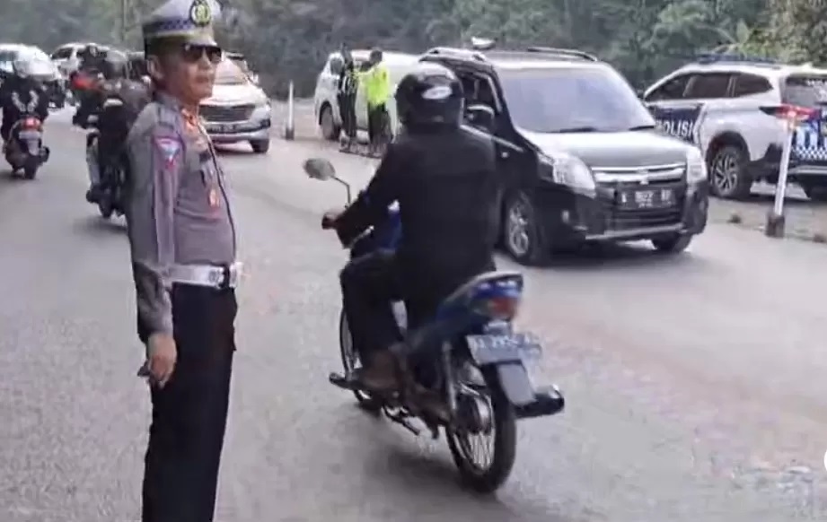 TERTIB: Jajaran Sat Lantas Polresta Padangpanjang mengatur kendaraan yang melewati jalan nasional jalur Padang-Bukittinggi via Lembah Anai yang dibuka untuk umum pada Minggu (21/7/2024).