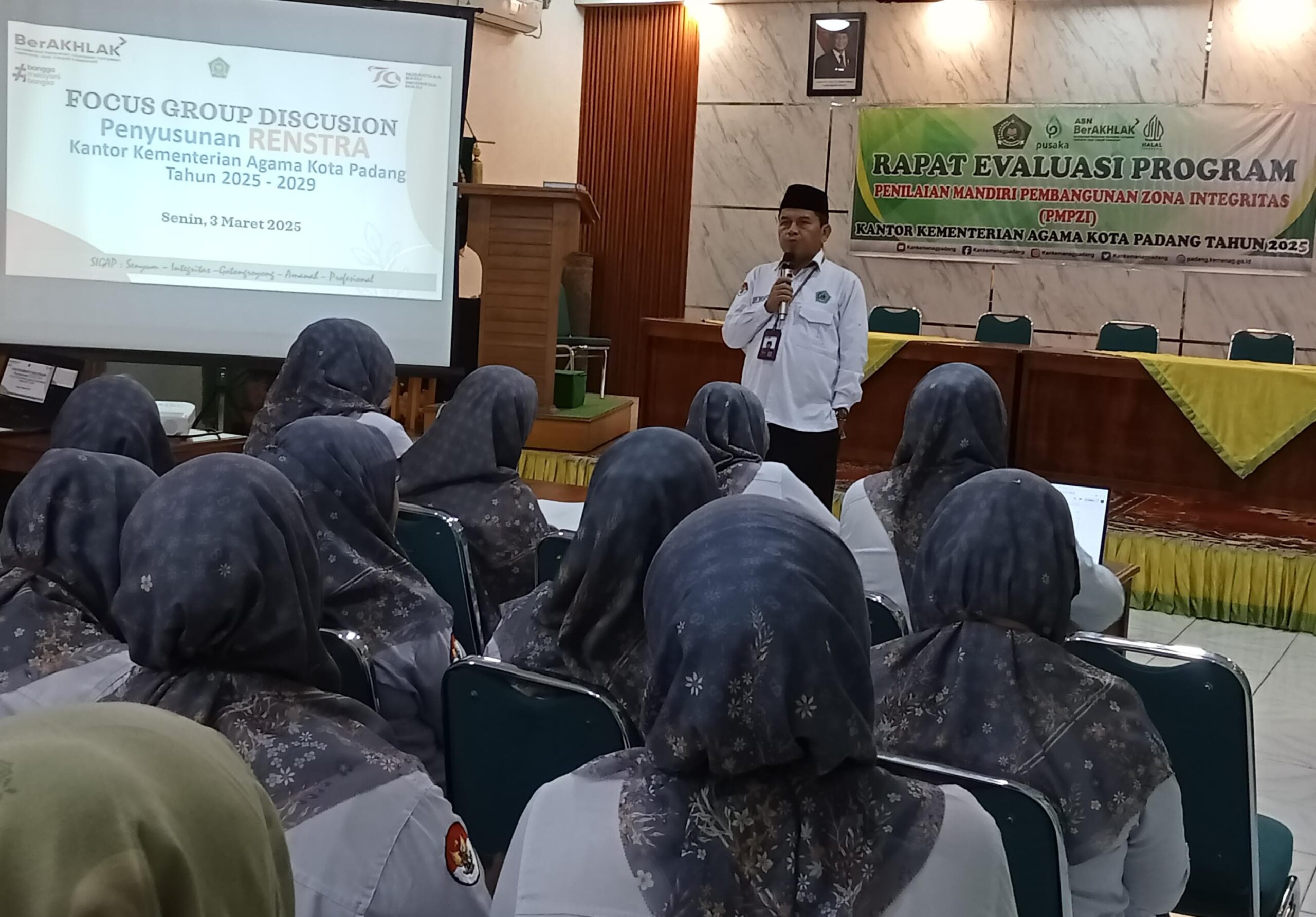 Padang, Sindotime-Focus Group Discussion (FGD) digelar Kantor Kementerian Agama Kota Padang di Aula Lantai 2, kantor Kemenag Padang pada Senin (3/3). Kegiatan ini dilaksanakan dalam rangka penyusunan Rencana Strategis (Renstra) Kantor Kementerian Agama Kota Padang untuk periode 2025-2029. FGD ini dipimpin langsung oleh H. Edy Oktafiandi, S.Ag, M.Pd, Kepala Kantor Kementerian Agama Kota Padang, dan dihadiri oleh Kasubbag TU, Kasi, Penyelenggara Zakat dan Wakaf, serta seluruh Tim Penyusun Renstra dari berbagai unit kerja.