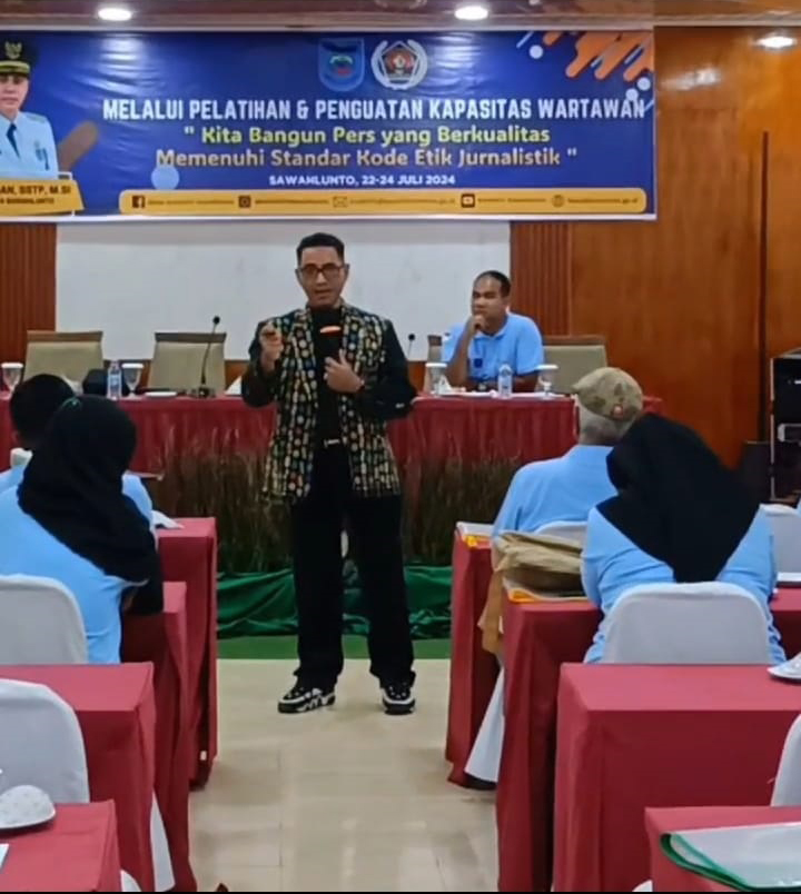 PAPARAN: Dosen Komunikasi Fisipol Unand Padang, MA Dalmenda Dt. Pamuntjak Alam memberikan materi saat Pelatihan dan Penguatan Kapasitas Wartawan di Parai Hotel, Sawahlunto, Selasa, (23/72024).