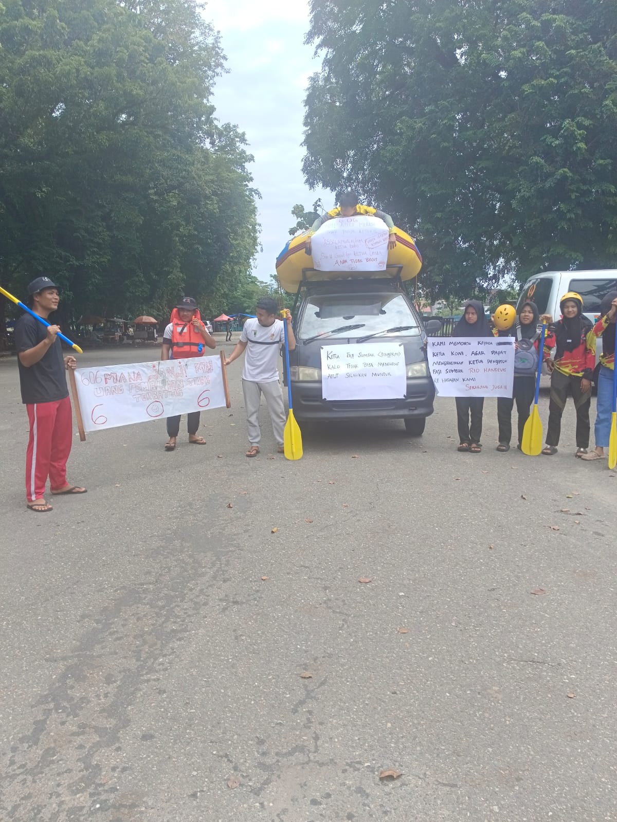 KECEWA: Atlet olahraga arung jeram yang telah dipastikan tampil di PON Aceh-Sumut, ketika menggelar aksi protes ke kantor KONI Sumbar.