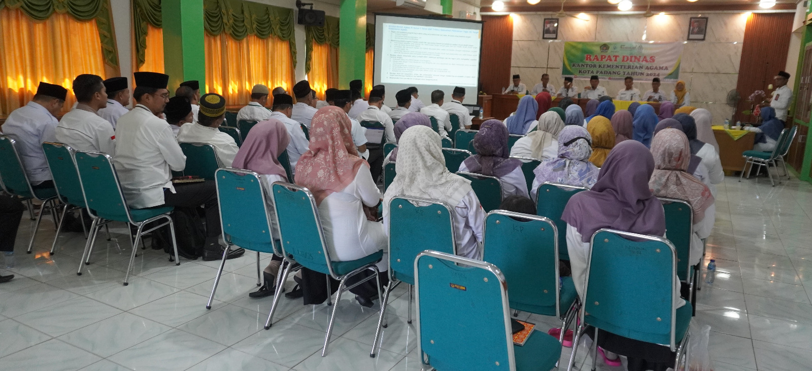 Padang, Sindotime-Kementerian Agama Kota Padang menggelar rapat dinas terkait evaluasi pelaksanaan anggaran dan pembangunan zona integritas menuju WBK – WBBM Satker dilingkungan Kantor Kementerian Agama Kota Padang tahun 2024, berlangsung di aula lt. 2 Kemenag setempat, Senin (23/9/2024).