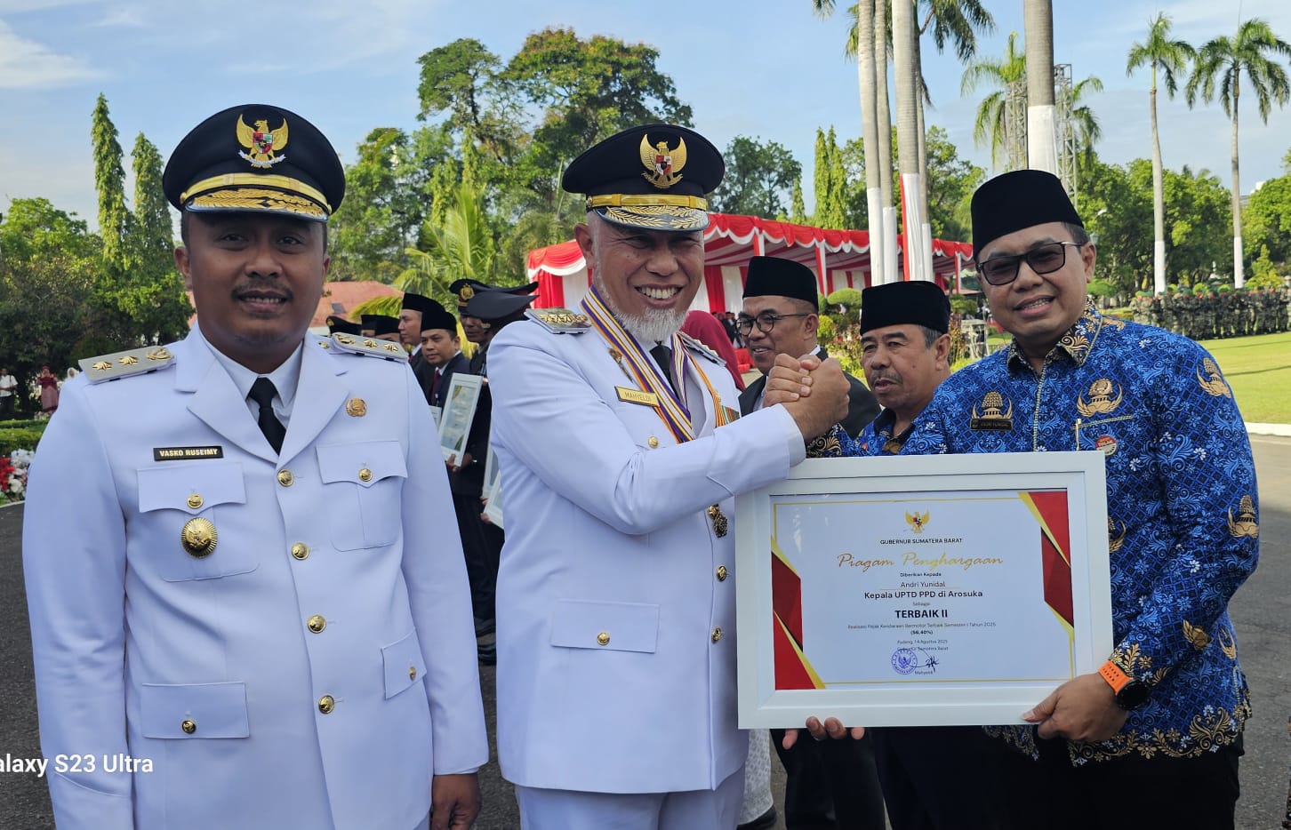 APRESIASI: Gubernur Sumbar, Mahyeldi Ansharullah didampingi Wagub Sumbar, Vasko Ruseimy menyerahkan reward terbaik kedua dalam pencapaian tertinggi target Samsat se-Sumbar kepada Kepala UPTD PPD Samsat Arosuka, Andri Yunidal saat pelaksanaan upacara Peringatan HUT RI ke-80 di halaman Kantor Gubernur Sumbar, Minggu (17/8).(pemprov sumbar)