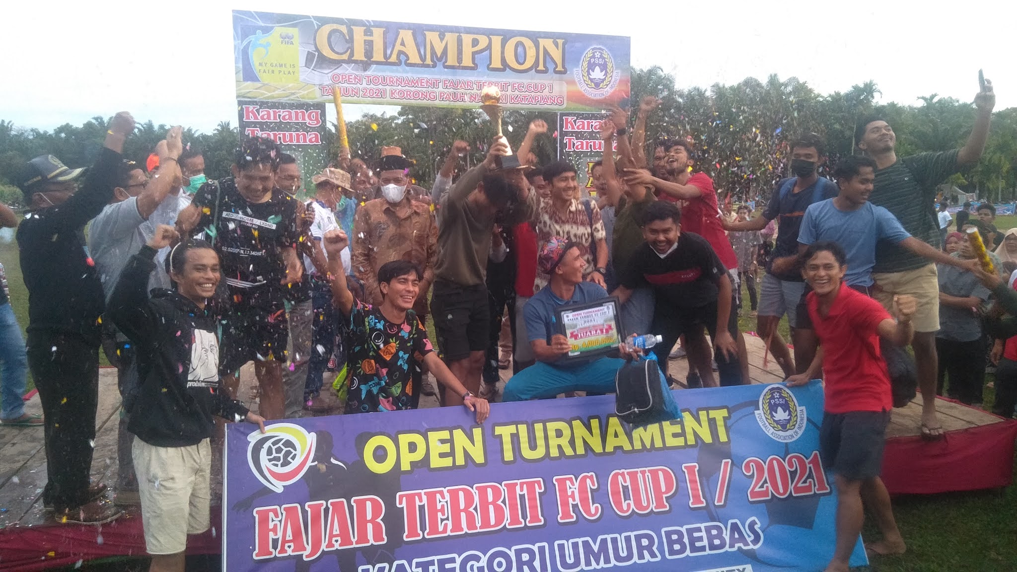 | PUAS: Tim PSTS Tabing menunjukan tropi juara di Open Turnamen Fajar Terbit FC Cup I/2021. |