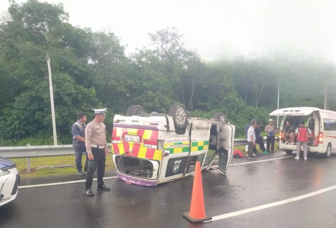 Ambulans dengan nomor polisi BA 9185 AK tersebut dilaporkan oleng dan menabrak pembatas jalan (kanstin) hingga akhirnya terbalik di lajur lambat.