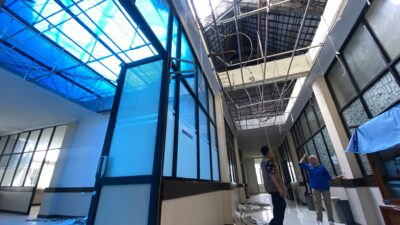 RUSAK : Atap Gonjong Balai Kota Payakumbuh terlihat diterbangkan angin kencang yang melanda Kota Rendang.(pemko…